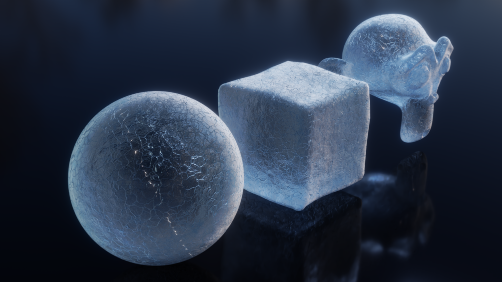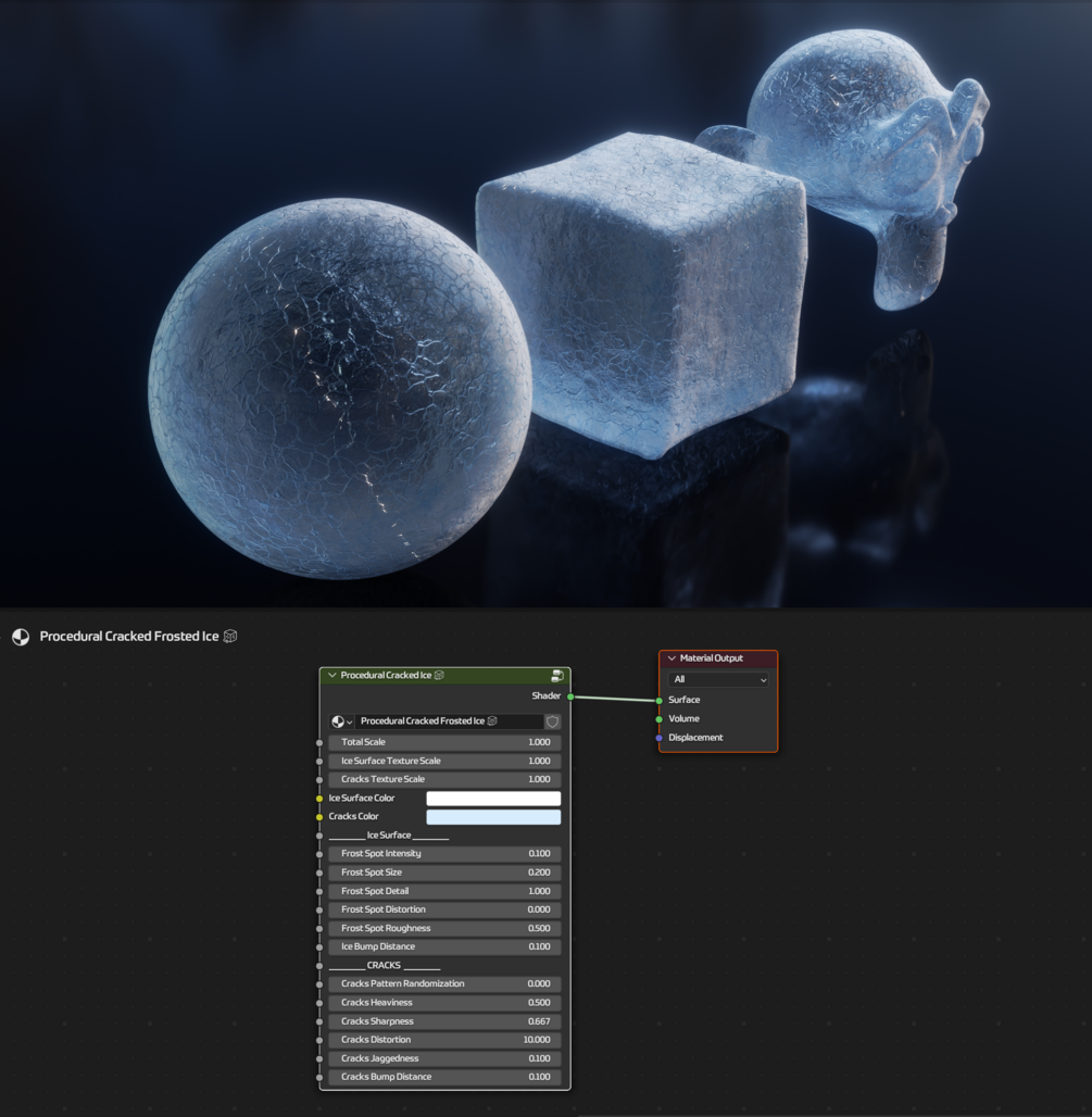 This product contains a Blender material for procedurally-generated frosted, cracked ice — tailored for an appearance like the one shown above with bumpy, frosty smudges; bumpy, indented cracks; and an overall translucent volume for the target object.
