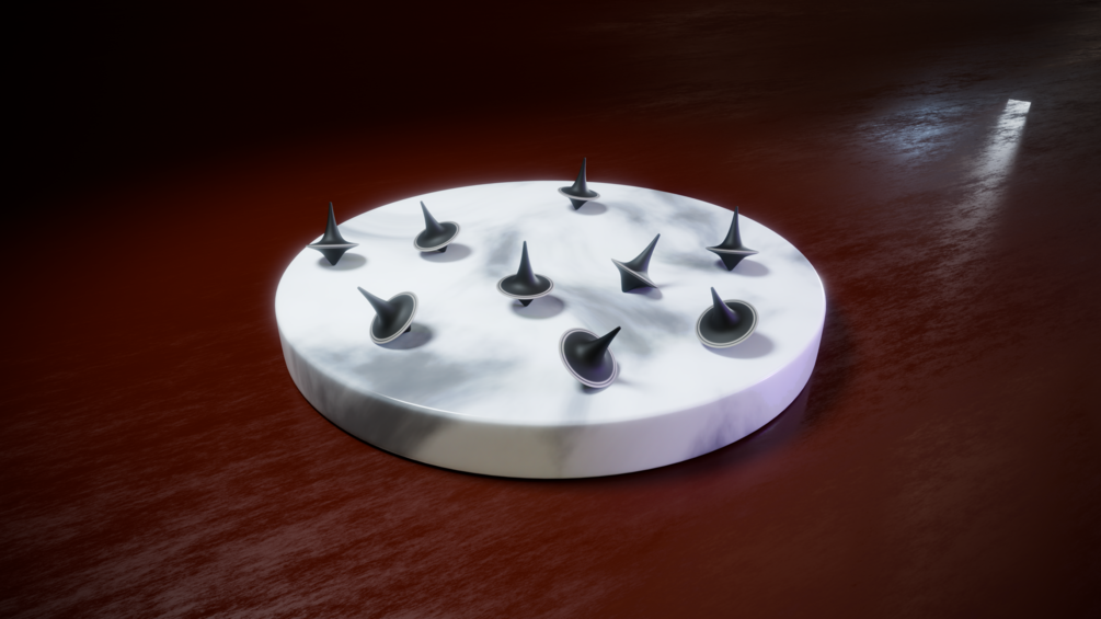 This product contains a model of a spinning top totem — inspired by the one used in Christopher Nolan’s Inception — crafted in Blender 4 and included with a starter procedural material that creates subtle textured rings at the widened “waist”.